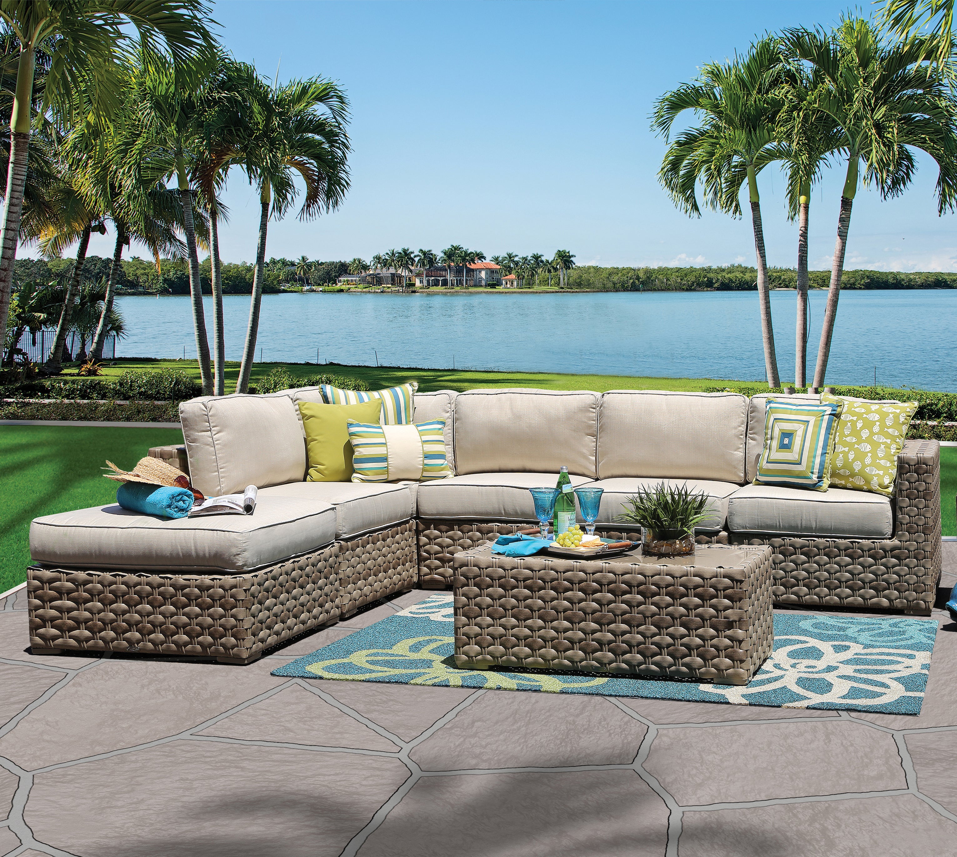 Bring a tropical vacation to your backyard with the Presidio outdoor sectional. The resin wicker is perfect to add a breezy feeling to your backyard.
