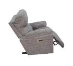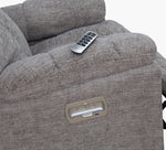 Sillón reclinable mecedor triple con respaldo capitoné de 104 cm de alto, brazos generosamente acolchados y chaise longue acolchado. Cuenta con reposacabezas, reclinación y soporte lumbar eléctricos. Incluye control remoto inalámbrico con puerto USB, botón de inicio y dos opciones de memoria para guardar las posiciones de reclinación. Requiere 25 cm de distancia a la pared para una reclinación completa. 100 % poliéster CC: S