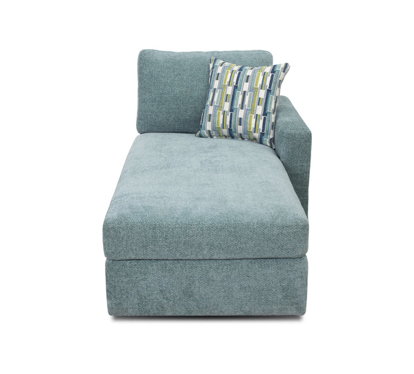 Chaise longue modular contemporánea RAF tapizada en poliéster color verde azulado. Incluye puertos de carga USB y USB-C ocultos en los brazos interiores y un cojín decorativo a juego. Descubre la colección.