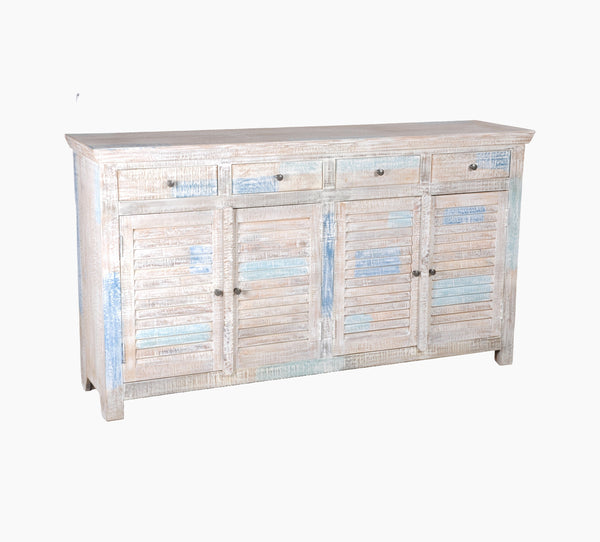 Este aparador de cuatro cajones y cuatro puertas cuenta con compartimentos interiores con estantes detrás de las puertas de lamas. Está fabricado con madera maciza de mango mediante el método de unión machihembrada y está sellado con laca resistente al agua en tonos azul y verde costero sobre un acabado encalado. El tratamiento de varios pasos permite que cada pieza sea única.