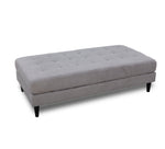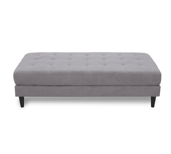 Otomana contemporánea de gran tamaño tapizada en una tela de poliéster gris suave. Presenta un perfil moderno con un diseño capitoné y patas cilíndricas cónicas.
