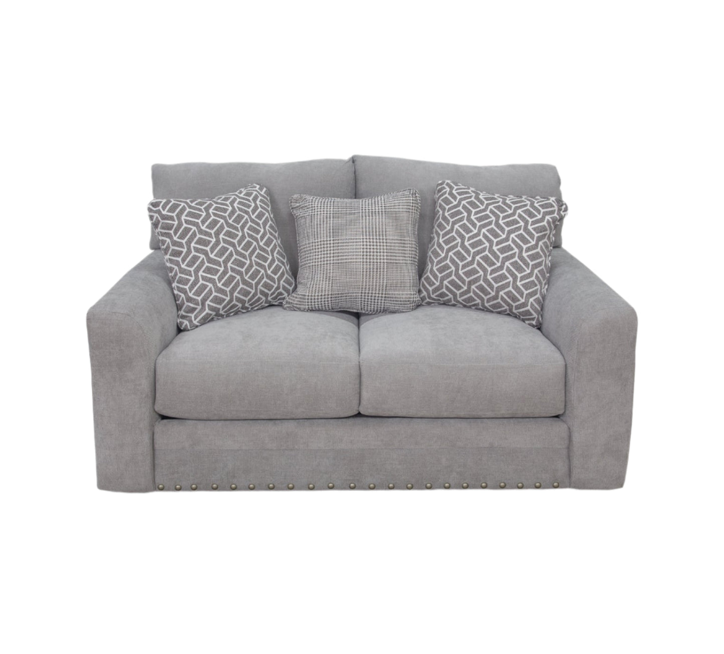 Loveseat deslizante de transición, dos sobre dos, tapizado en tela de poliéster gris. Su estilo informal presenta ribetes decorativos con tachuelas, brazos interiores curvos, cojines de asiento sueltos y reversibles, y respaldos semi-adosados. El loveseat deslizante incluye 3 cojines decorativos: 2 con diseño geométrico y 2 con diseño a cuadros. 100 % poliéster CC: WS