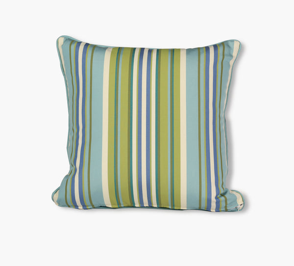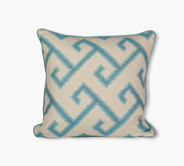 Cojín decorativo resistente a la intemperie de 50,8 x 50,8 cm con diseño reversible por delante y por detrás, tapizado 100 % acrílico teñido en solución resistente a la decoloración. Anverso: El Greco Calypso/Reverso: Pursuit Aqua. Incluye ribete en contraste en Sparkle Pool y cremallera para mayor comodidad. Hecho a mano en EE. UU.