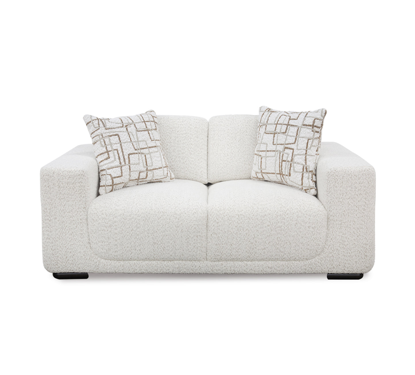 Estilo contemporáneo, tapizado en tela bouclé color crema. Cuenta con brazos anchos, cojines de respaldo sueltos y patas de madera de nogal. El loveseat incluye dos cojines decorativos. 100 % poliéster (CC: S)