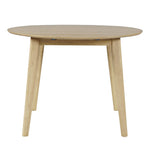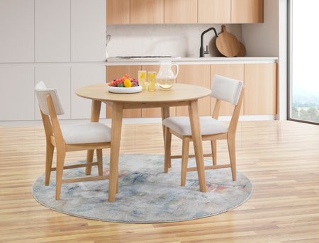 Esta mesa de dos hojas abatibles presenta un acabado natural con un tablero de chapa de roble Sunlit y patas y estructura de madera maciza de caucho. Cada pieza está cepillada con alambre para mayor textura y profundidad. Combina con sillas laterales tapizadas en beige para mayor comodidad. 71 cm de largo x 106 cm de profundidad x 76 cm de alto, se extiende hasta 106 cm de diámetro con hojas de 2 a 18 cm.