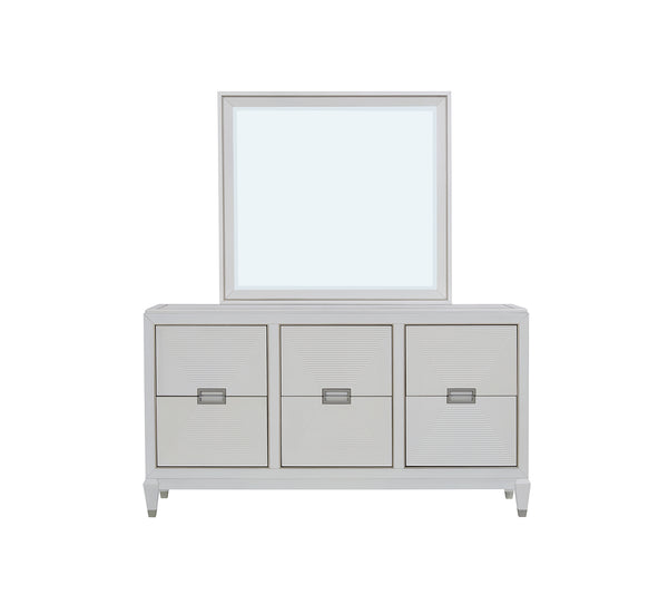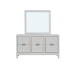 Espejo biselado elaborado con madera maciza de pino y álamo, con chapas de álamo en un elegante acabado pintado en piedra lunar. Cómoda no incluida.