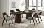 Fabricado con madera maciza y chapa de roble blanco en acabado espresso, presenta una elegante base de pedestal semicircular con lengüeta. Sillas laterales tapizadas a juego completan el conjunto.