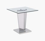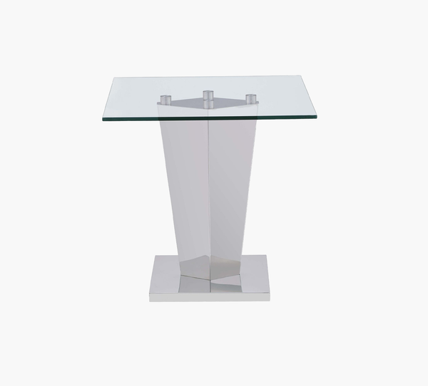 Mesa auxiliar contemporánea de acero inoxidable pulido y elegante con una superficie de vidrio fundido de 10 mm. Esta colección de gran estilo actualizará cualquier habitación con esta sofisticada y moderna pieza de conversación.