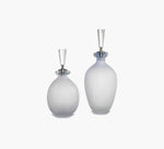 Recipientes de vidrio burbuja de color azul pálido con tapones cilíndricos de cristal y níquel pulido escalonados.
