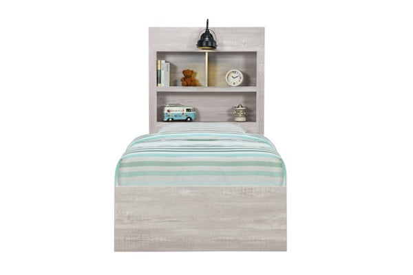Cama individual con librería de estilo rústico con acabado gris claro y blanco lavado. Cuenta con un cabecero con tres compartimentos de almacenamiento, perfectos para libros o recuerdos. La lámpara industrial le aporta estilo y funcionalidad. Incluye bombilla LED. Utiliza una bombilla estándar de 60 vatios o una bombilla LED A19 E26 equivalente. Se recomienda una base de perfil bajo.
