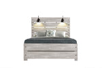 Cama de estilo rústico con paneles completos y acabado gris claro y blanco lavado. Cuenta con un cabecero de tablones y una lámpara industrial que le aporta estilo y funcionalidad. Incluye bombilla LED. Utiliza una bombilla estándar de 60 vatios o una bombilla LED A19 E26 equivalente. Se recomienda una base de perfil bajo.