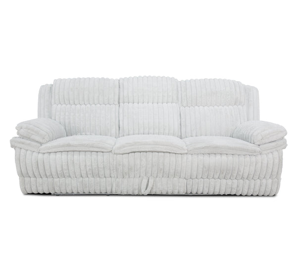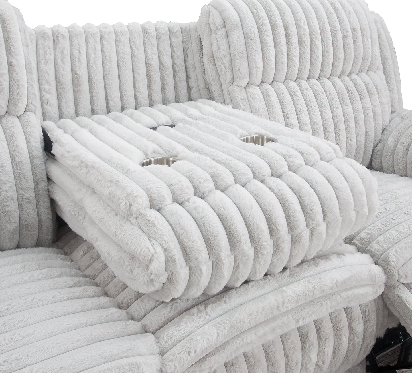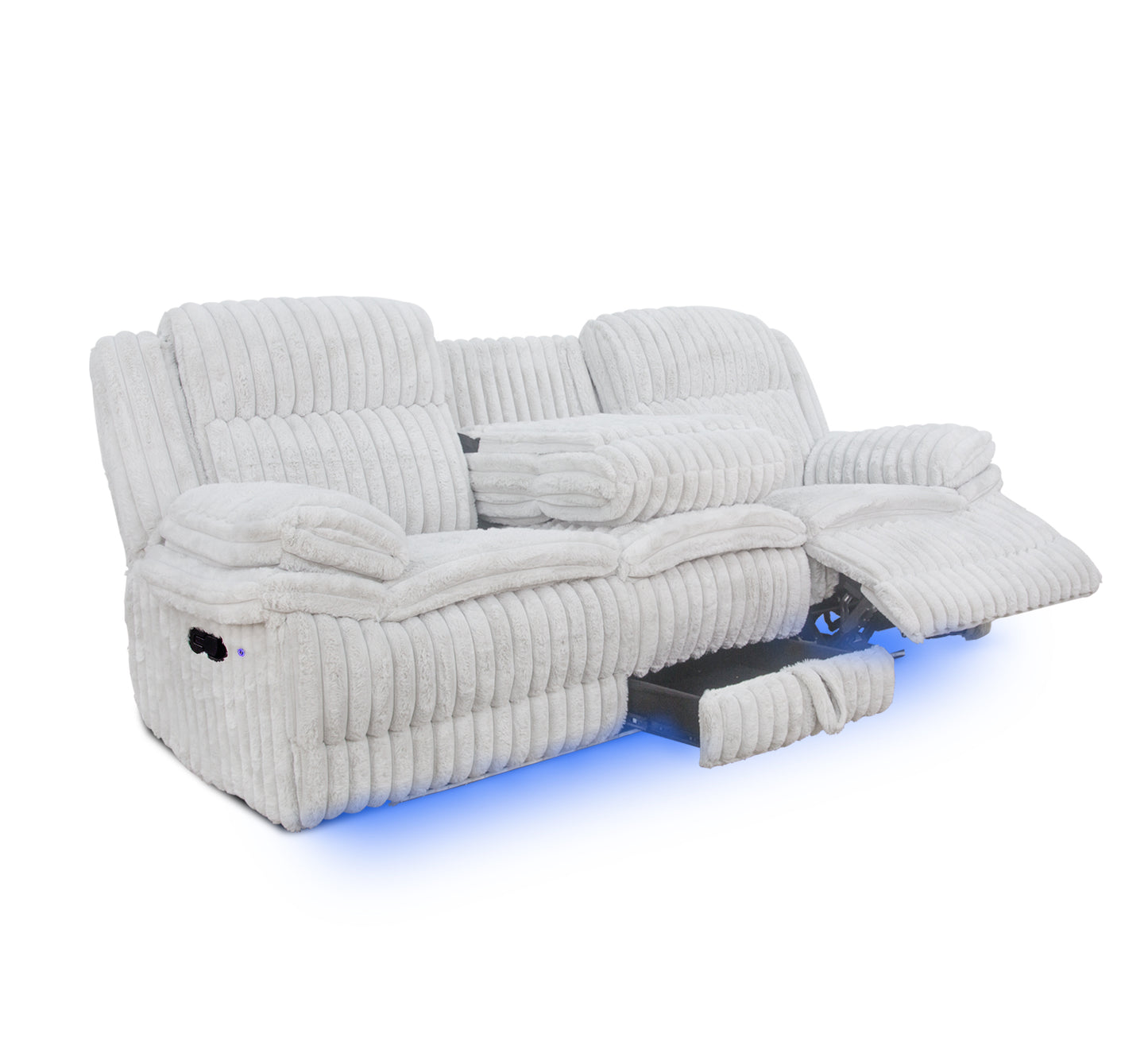 Estilo contemporáneo tres sobre tres, tapizado en tela de pana gris claro de canalé ancho. Incluye un cajón de almacenamiento oculto y una mesa abatible con portavasos. 100 % poliéster CC: W