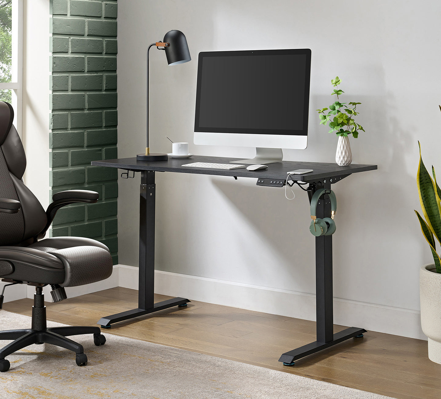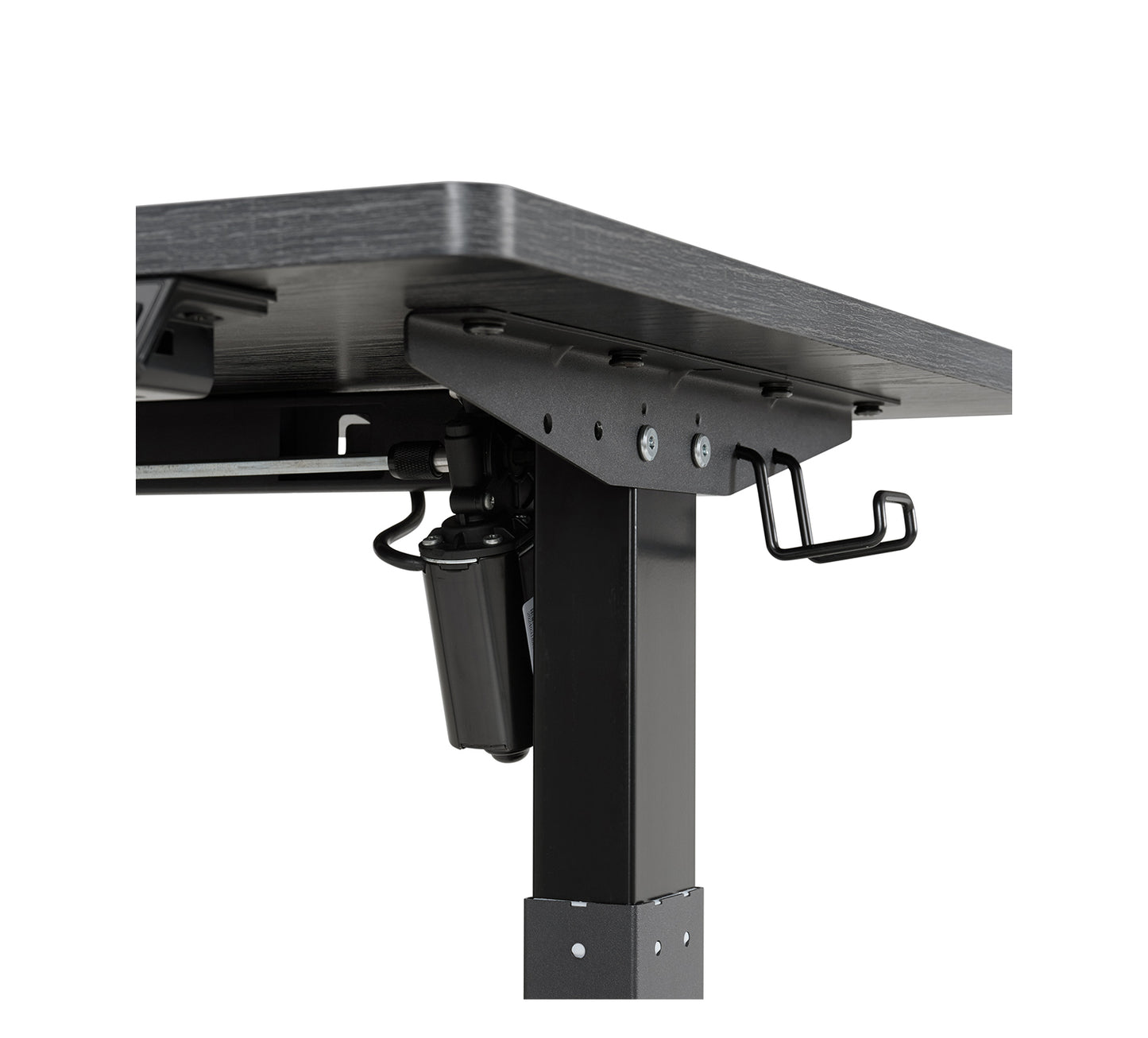 El escritorio Oakland cuenta con una robusta estructura de acero, altura ajustable con configuraciones programables y gestión de cables integrada. Su amplia superficie, soportes para auriculares y patas antideslizantes ofrecen comodidad y estabilidad.