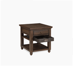 Estilo tropical en chapas de acacia, madera maciza y madera contrachapada. Los detalles incluyen una cesta de ratán extraíble, un cajón, tableros de tablones y marcos para fotos. Un pomo de latón bruñido añade un toque de color al frente.