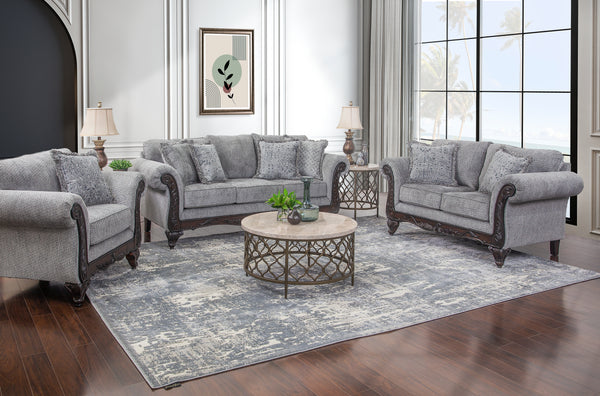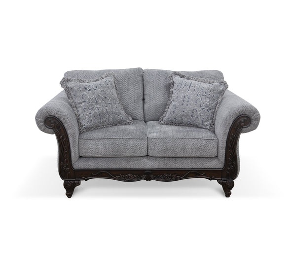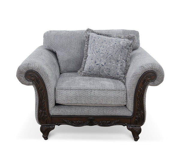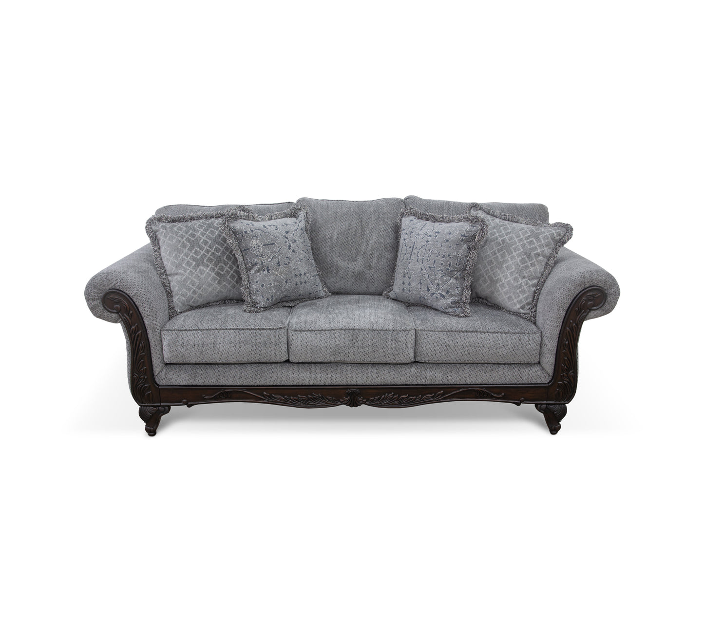 Estilo tradicional con brazos enrollados y hermosos detalles tallados. Los brazos de madera vista, las patas cabriolé y la base de madera presentan motivos de volutas y fauna. El sofá incluye 4 cojines con flecos: 2 con diseño de rombos y 2 con estampado integral. El loveseat incluye 2 cojines con flecos con estampado integral. La silla incluye 1 cojín con flecos con estampado integral. Cuenta con cojines de respaldo integrados y cojines de asiento sueltos e irreversibles. 100 % poliéster. CC: S