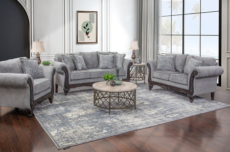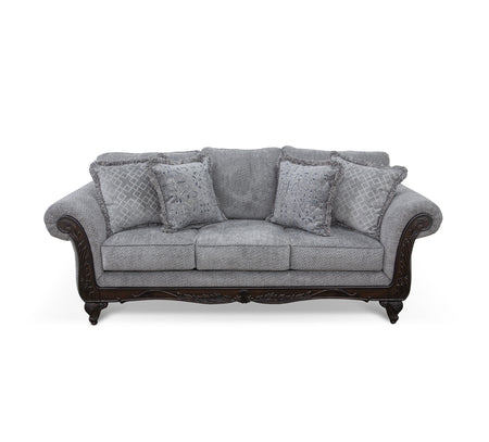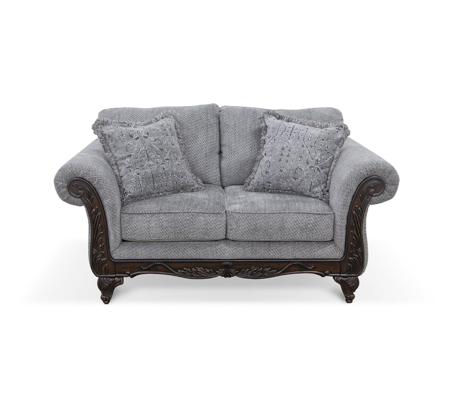 Estilo tradicional con brazos enrollados y hermosos detalles tallados. Los brazos de madera vista, las patas cabriolé y la base de madera presentan motivos de volutas y fauna. El loveseat incluye dos cojines decorativos con flecos con un estampado integral. Cuenta con cojines de respaldo integrados y cojines de asiento sueltos e irreversibles. 100 % poliéster. CC: S