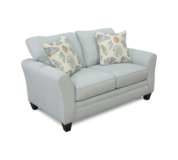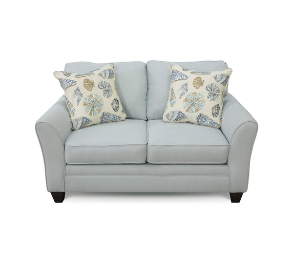 Loveseat Coastal de dos plazas, tapizado en poliéster color turquesa pálido. Presenta brazos acampanados, ribete a juego, cojines de respaldo sueltos y asientos reversibles tipo caja. Incluye dos cojines decorativos con diseño de conchas. 100 % poliéster CC: W