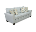 Sofá y loveseat de estilo costero tapizados en tela de poliéster color turquesa pálido, y una silla decorativa tapizada con un estampado costero integral. Presenta brazos acampanados, ribete a juego y cojines de respaldo sueltos. El sofá cama incluye 4 cojines decorativos: 2 con diseño de conchas y 2 con estampado integral.