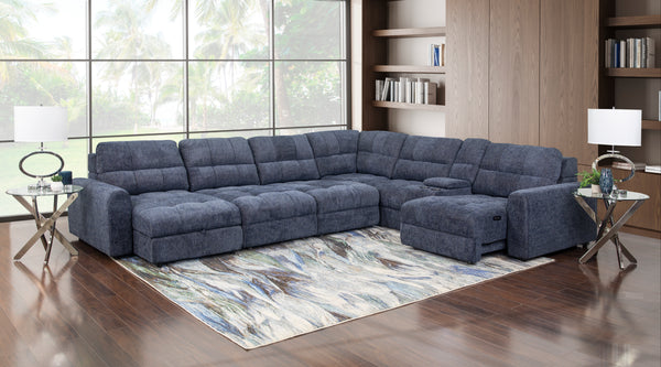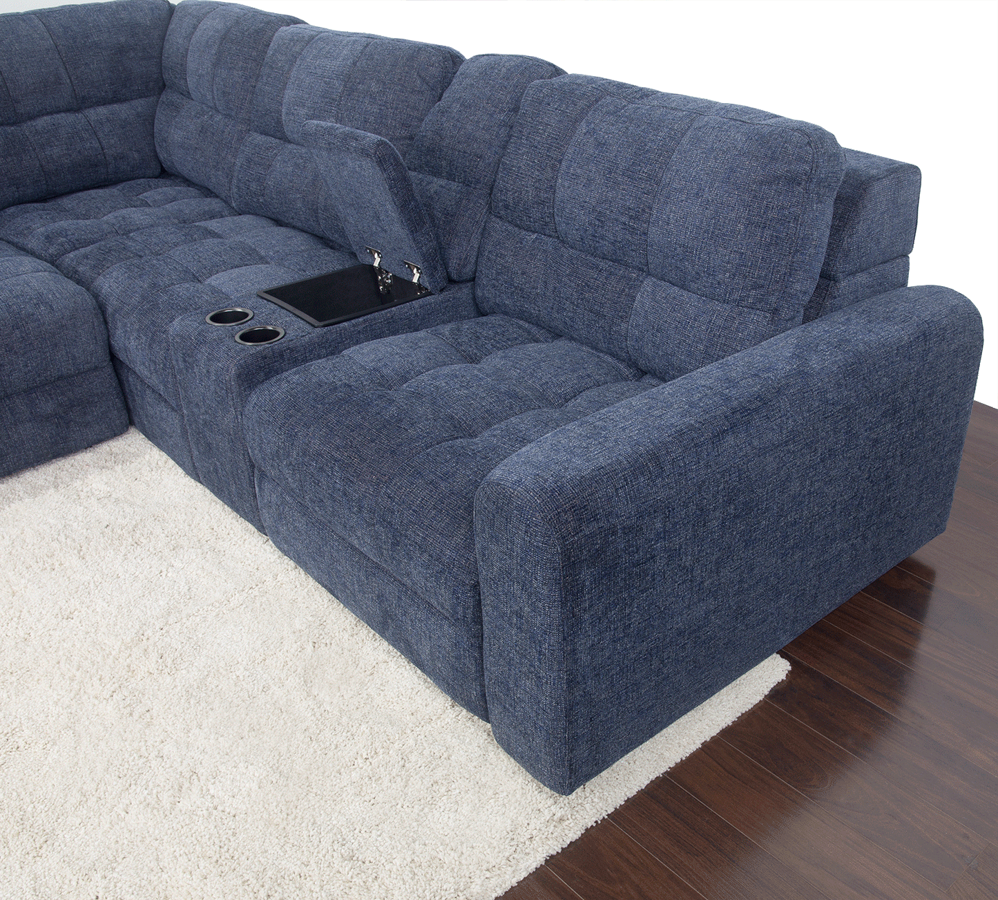 Sillón modular contemporáneo tapizado en tela de poliéster azul oscuro. Los asientos deslizantes exclusivos incluyen una función de movimiento oculto que ofrece mayor profundidad y comodidad. La consola incluye carga USB/USB-C, portavasos de acero inoxidable extraíbles y un compartimento de almacenamiento con tapa. El diván incluye almacenamiento oculto debajo de los cojines del asiento. 100 % poliéster CC: S