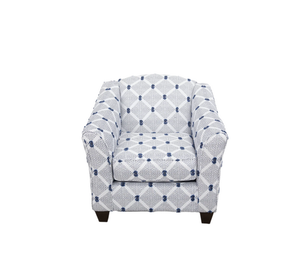 Tela: 100 % poliéster CC: W. Silla decorativa de estilo transicional, tapizada en tela de poliéster con estampado blanco y azul. Cuenta con brazos acampanados, cojines de asiento ribeteados y en forma de caja, y elegantes patas con acabado de madera.