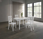 The Sandpiper collection is crafted from hardwood solids and engineered wood for lasting durability, featuring a dining table in a pure white finish that offers a clean, versatile backdrop for any decor. This five-piece set includes four matching diamond-back side chairs in pure white; each designed for comfort and reliability with a weight capacity of up to 250 lbs, making this set as practical as it is stylish for your dining space