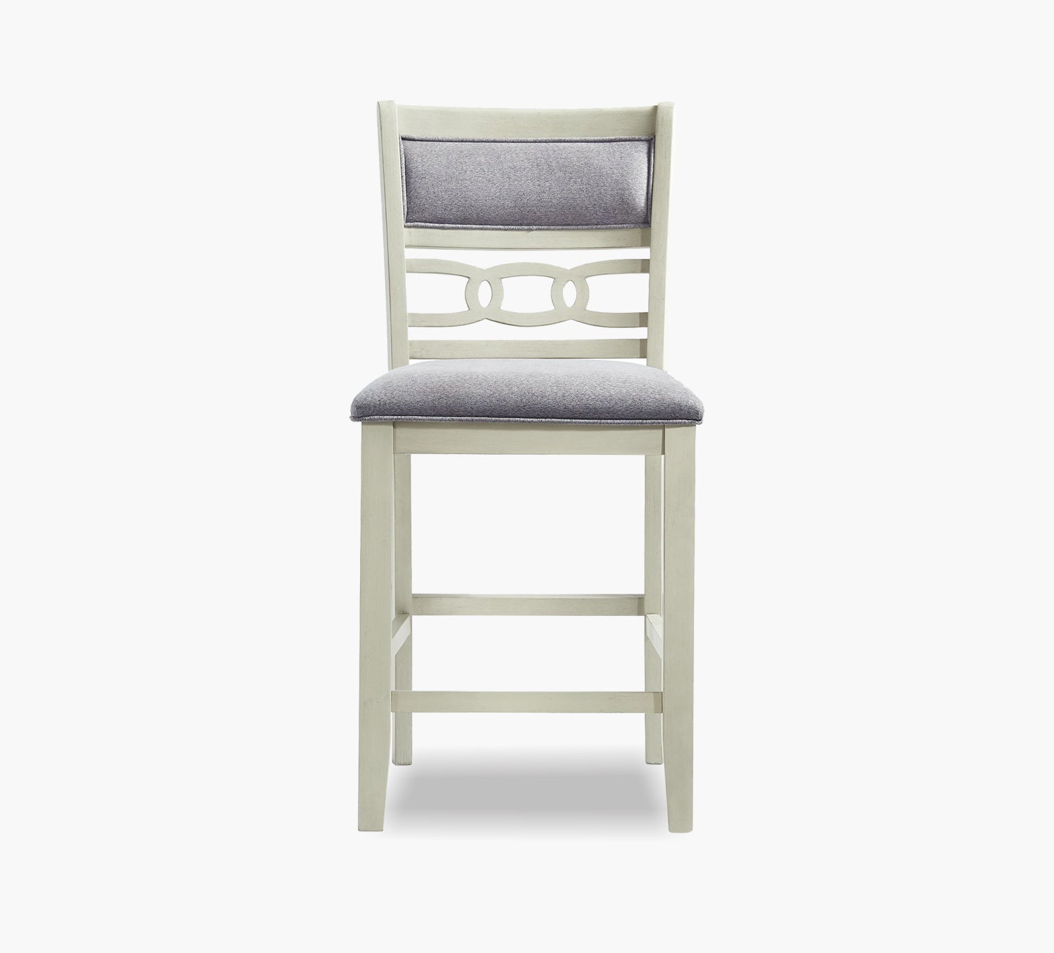 The Albert White Pub Chair offers a cushioned seat and back upholstered in 100% polyester grey fabric for comfort and easy care. The chair includes a footrest for added support and features subtle geometric detailing on the back for a stylish touch. Each chair supports up to 300 lbs. Cleaning Code: WS