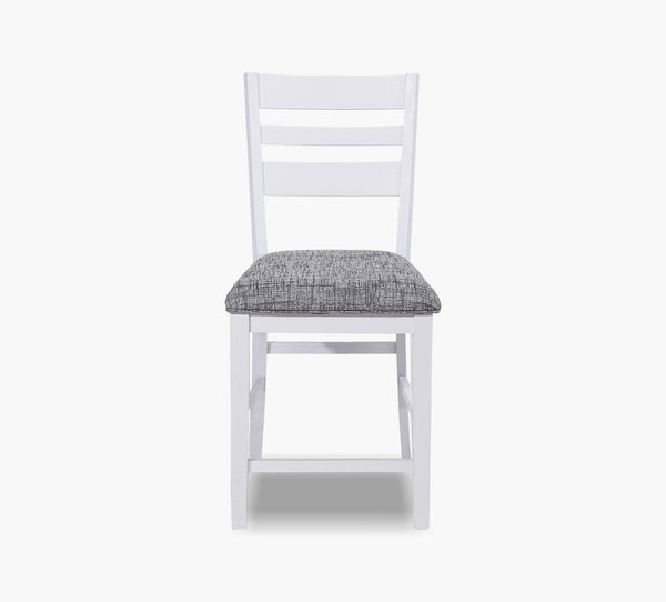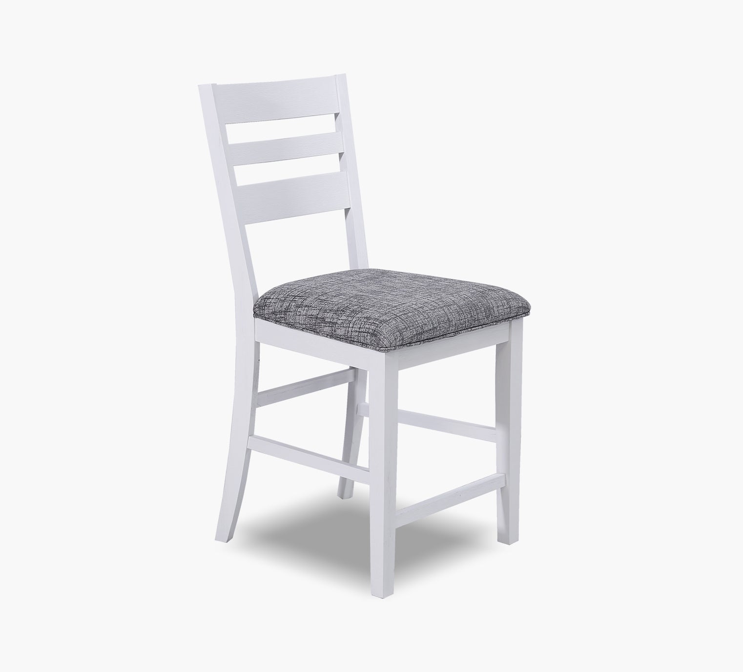 The Altamonte counter stool blends modern style with everyday comfort. Its classic ladder back design is finished in a soft white wire brushed tone, perfectly complemented by a cushioned seat upholstered in a chic gray fabric. The fabric is a durable blend of 73 percent polyester and 27 percent cotton for easy care, while a bold silver accent on the back adds a contemporary touch. Built for strength and style, this stool supports up to 275 pounds, making it a practical and elegant choice for your dining or counter space.