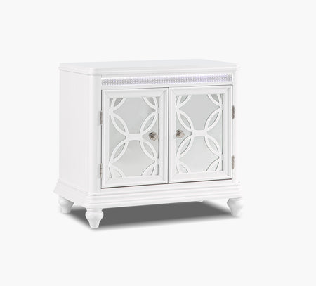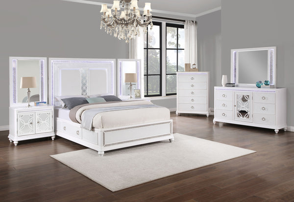 Embellished borders with inlaid acrylic crystal-like detailing abound in this glamorous bedroom. White painted finish. LED lighting on most pieces creates a sparkling glow. Six drawer dresser features a mirrored door with a striking overlay in the center. Includes one shelf behind the door. Crafted of poplar solids and durable engineered wood. Drawers have full extension metal side guides and dovetail joinery. Felt lined top drawers. Nightstand Includes one shelf behind the doors. Requires mattress only. Weight Limit: 600 Lbs.
