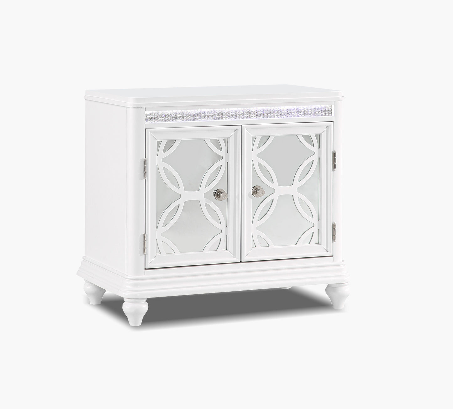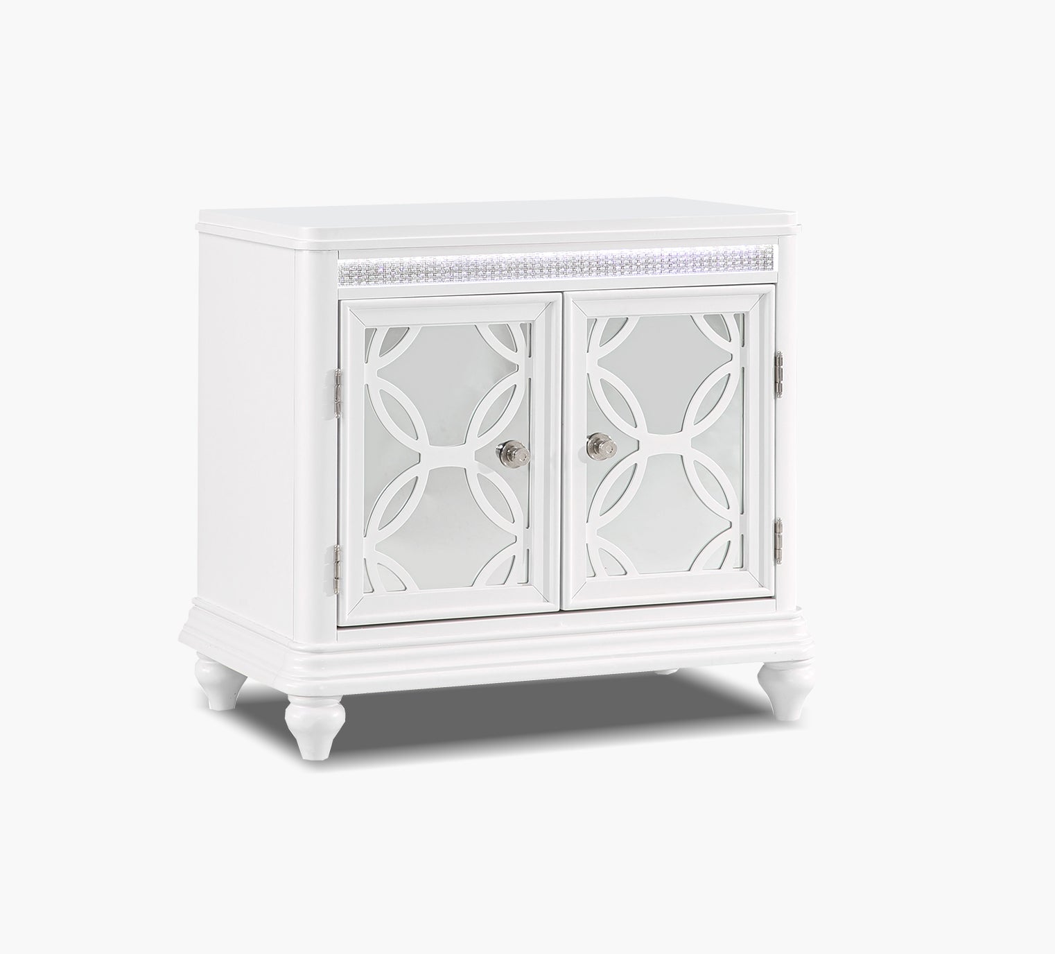 The Anastasia nightstand delivers a glamorous look with LED lighting and crystal-like inlay detailing. Two mirrored doors with a bold overlay open to reveal a shelf for storage. Finished in white and crafted from poplar solids and engineered wood, it combines style with functionality.