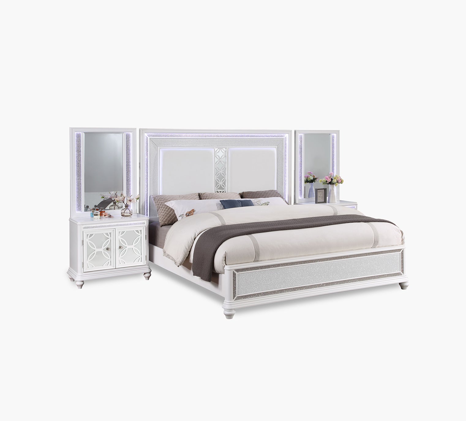 Glam king wall bed with LED lighting and inlaid acrylic crystal-like detailing. Features a striking overlay in the mirrored center. White painted finish and white polyurethane fabric. Nightstand Includes one shelf behind the doors. Weight Limit: 600 Lbs.