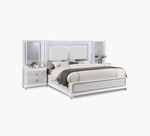 Glam king wall storage bed with LED lighting and inlaid acrylic crystal-like detailing. Features a striking overlay in the mirrored center. White painted finish and white polyurethane fabric. Includes one drawer on each side of bed. Top nightstand drawer felt lined and includes a tray. Requires mattress only. Weight Limit: 600 Lbs.