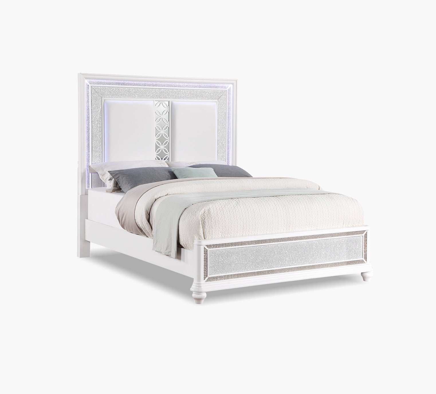 Glam queen upholstered bed with LED lighting and inlaid acrylic crystal-like detailing. Features a striking overlay in the mirrored center. White painted finish and white polyurethane fabric. Weight Limit: 600 Lbs.