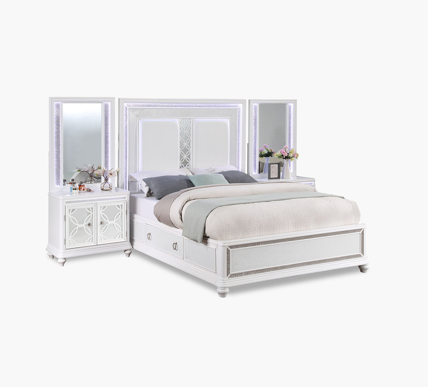 Glam queen wall storage bed with LED lighting and inlaid acrylic crystal-like detailing. Features a striking overlay in the mirrored center. White painted finish and white polyurethane fabric. Includes one drawer on each side of bed. Nightstand Includes one shelf behind the doors Requires mattress only. Weight Limit: 600 Lbs.