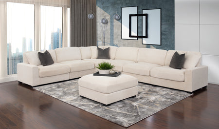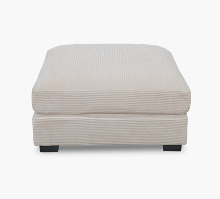Contemporary modular corner upholstered in a 100% polyester beige corduroy. Features loose seat cushions, reversible back cushions, and deep seating for a relaxed and casual fit. Each piece is upholstered on all sides so they can be used individually. Includes one throw pillow.
