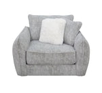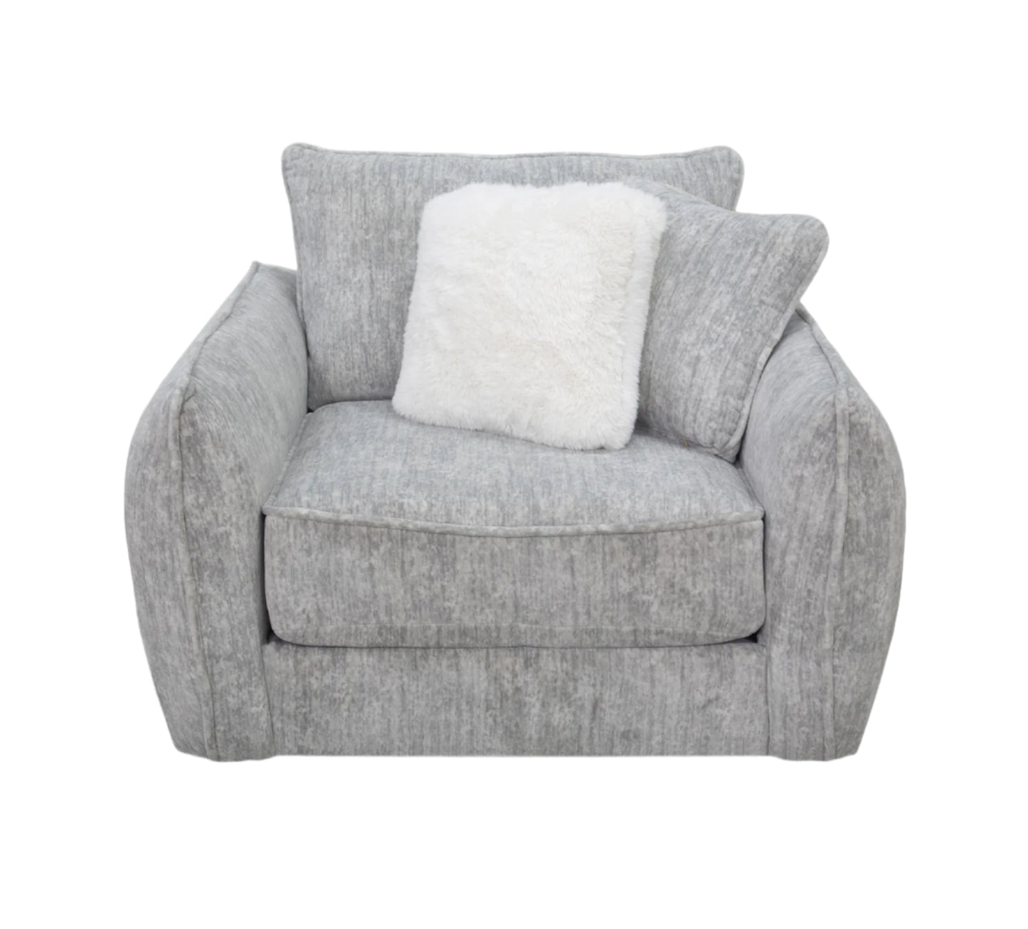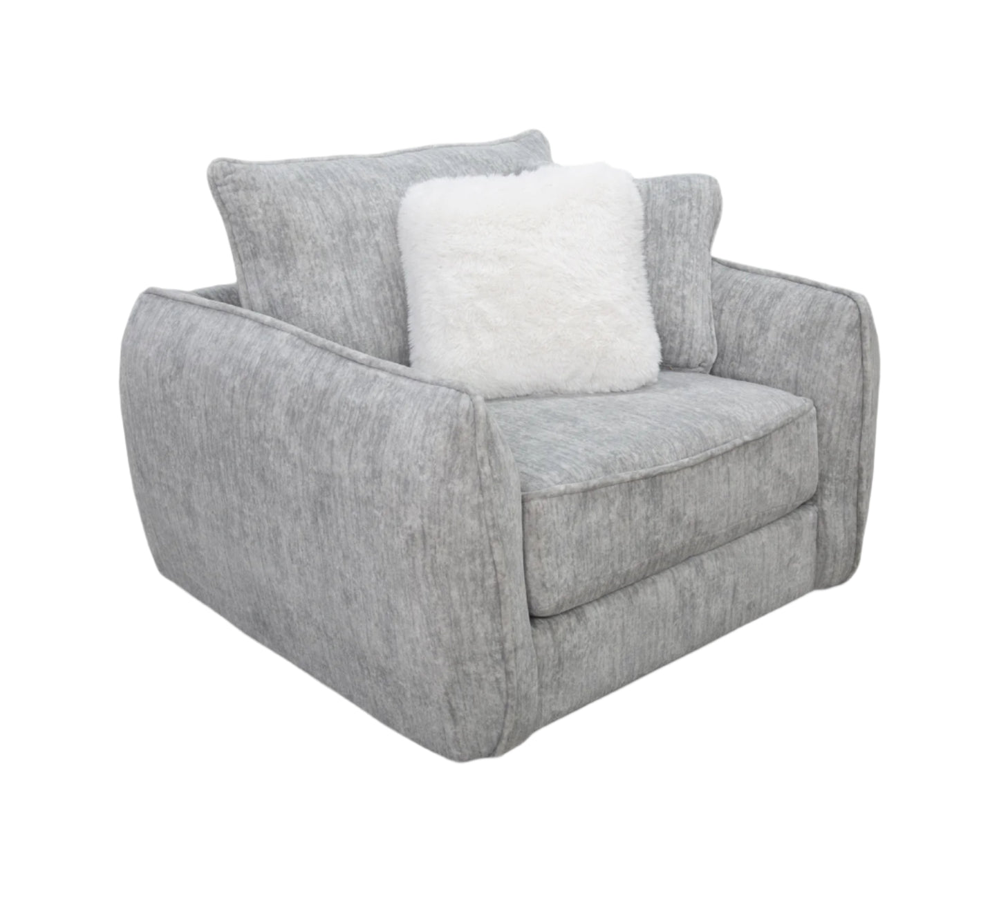 Contemporary oversized chair upholstered in a soft, light grey printed fabric with a jumbo welt accent. Features a crescent arm with loose seat and back cushions for ultimate style and comfort. Includes one matching throw pillow and one correlate throw pillow. 100% Polyester CC: W