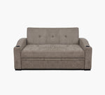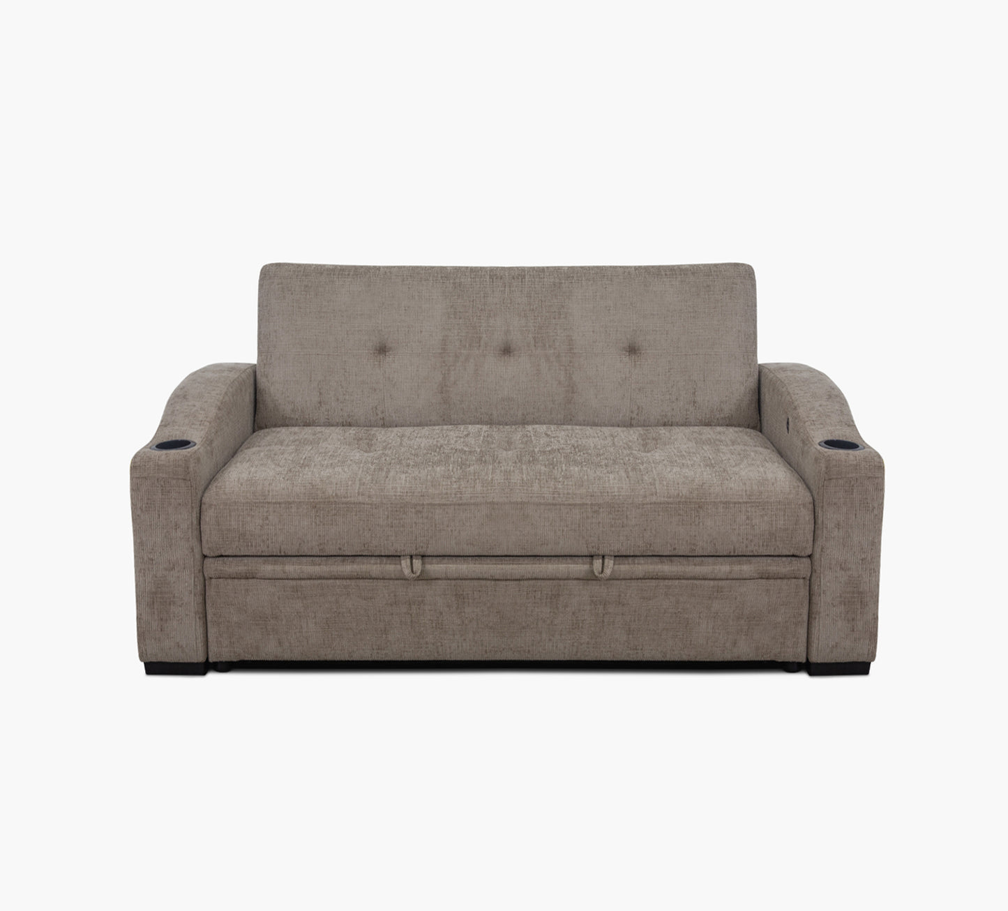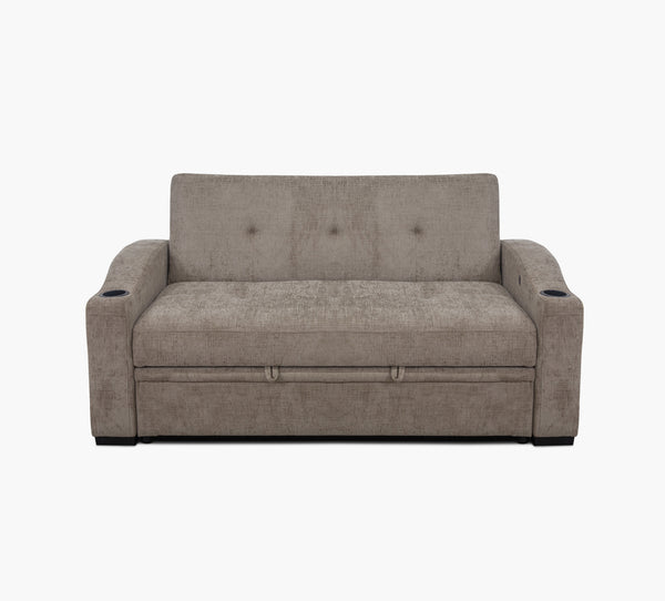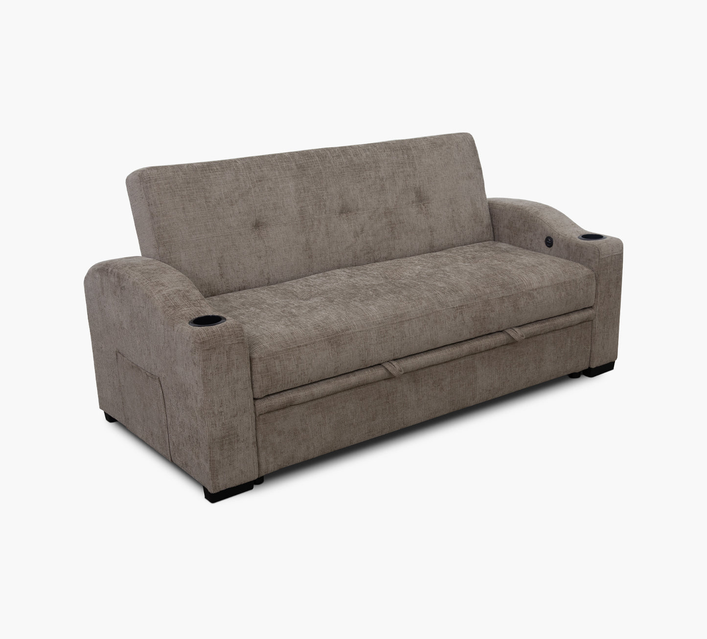 Contemporary sofa with pop-up ottoman upholstered in a soft, light brown fabric. Features a USB & USB-C port in one arm, removeable cupholders on each arm, and an additional outside arm pocket for added convenience as you relax. Versatile ""click clack"" back can lay completely flat. Unique pop-up feature doubles as both a sleeper and an ottoman. 100% Polyester CC: W"