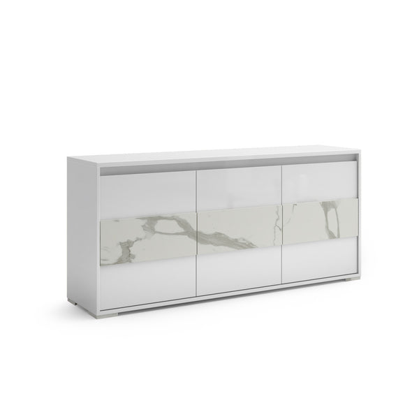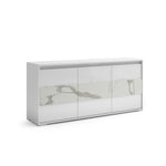 Modern sideboard crafted in Italy from MDF with a sleek white anti-yellowing high-gloss polyester lacquer finish and unique faux marble inserts on soft-close doors. It features open adjustable shelving behind each set of doors.