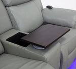 Top grain leather everywhere you sit matched with vinyl. Triple power motors in each recliner offer power recline, power headrests, and power lumbar. Features a zero gravity air massage system with heat. Extras include lighted base rails and a wood swivel table that opens to reveal storage in the console loveseat. The control wands feature a home button, a multi-push button to control the massage intensity, and a USB port. The base rail lights are controlled by a button on the outside arm.