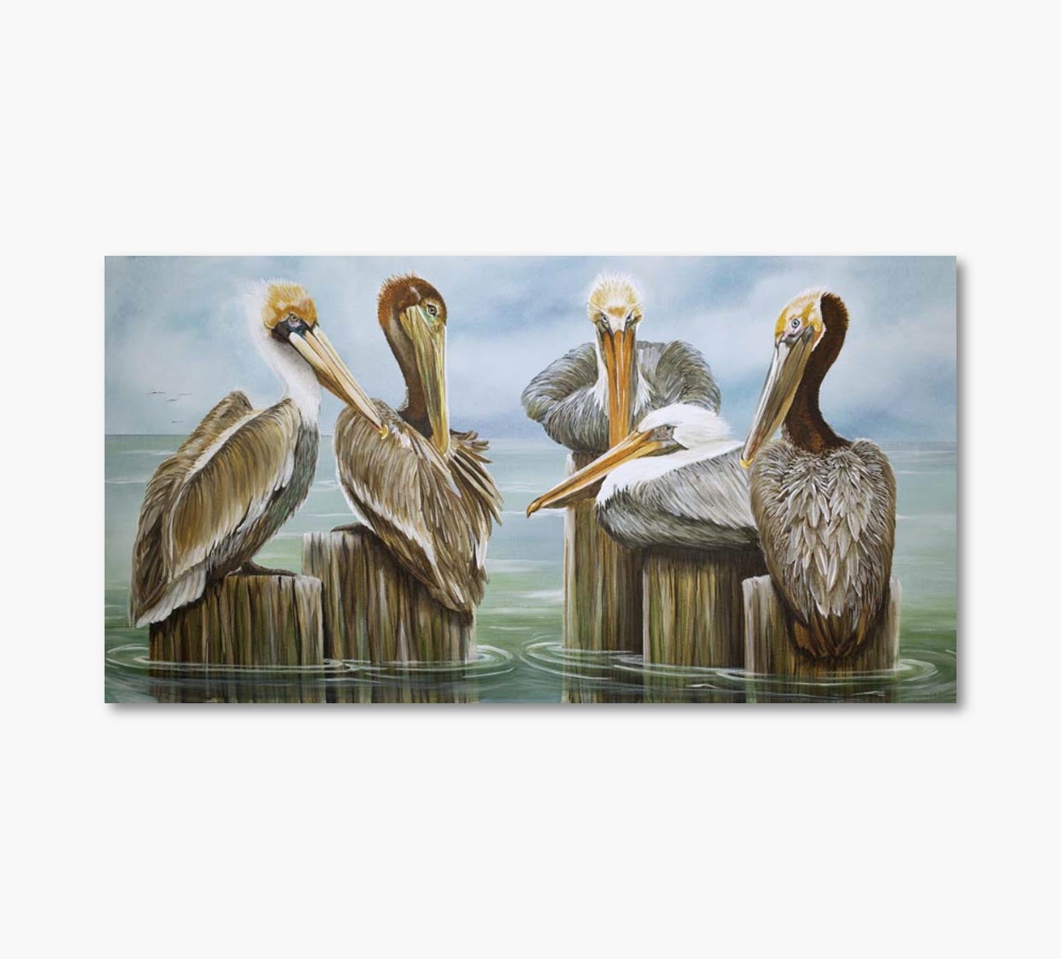 This 24" x 44" artwork features five pelicans perched upon posts having a board meeting, with an accentuation of the sea and sky. It is professionally painted on canvas. Its vibrant colors and detailed imagery are sure to draw attention and add a unique flair to any setting.
