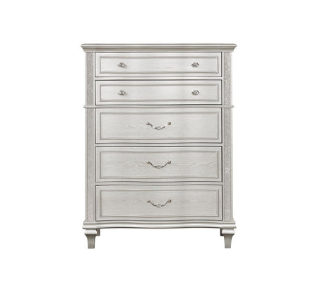 Crafted from Acacia wood, the Bridgette three-drawer nightstand features a sophisticated painted silver finish accented with decorative metal pulls. Each drawer is equipped with full-extension ball-bearing glides for smooth, durable functionality, while the top drawers include a luxurious red felt lining to protect delicate items.