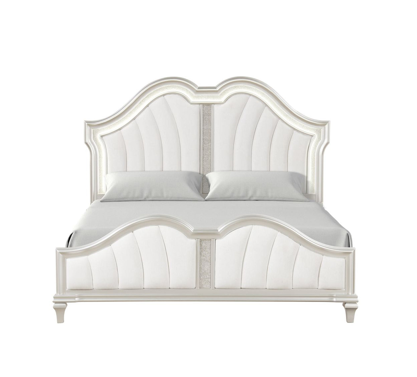 The Bridgette Bed is crafted from Acacia wood and designed for a contemporary glam aesthetic. Its LED-lighted, scalloped upholstered headboard and footboard are finished in a sleek painted silver tone, creating a dramatic yet elegant centerpiece for your bedroom. Weight limit: 800 lbs. Upholstery: 100% Polyester | Cleaning Code: X.