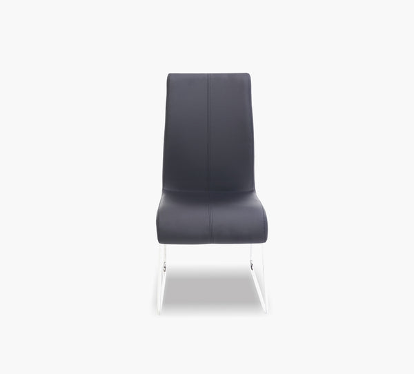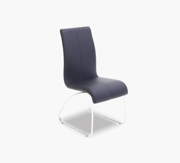 Side chair with a black leather-like back and seat on a chrome sled base. Fabric polyurethane, cleaning code WS.