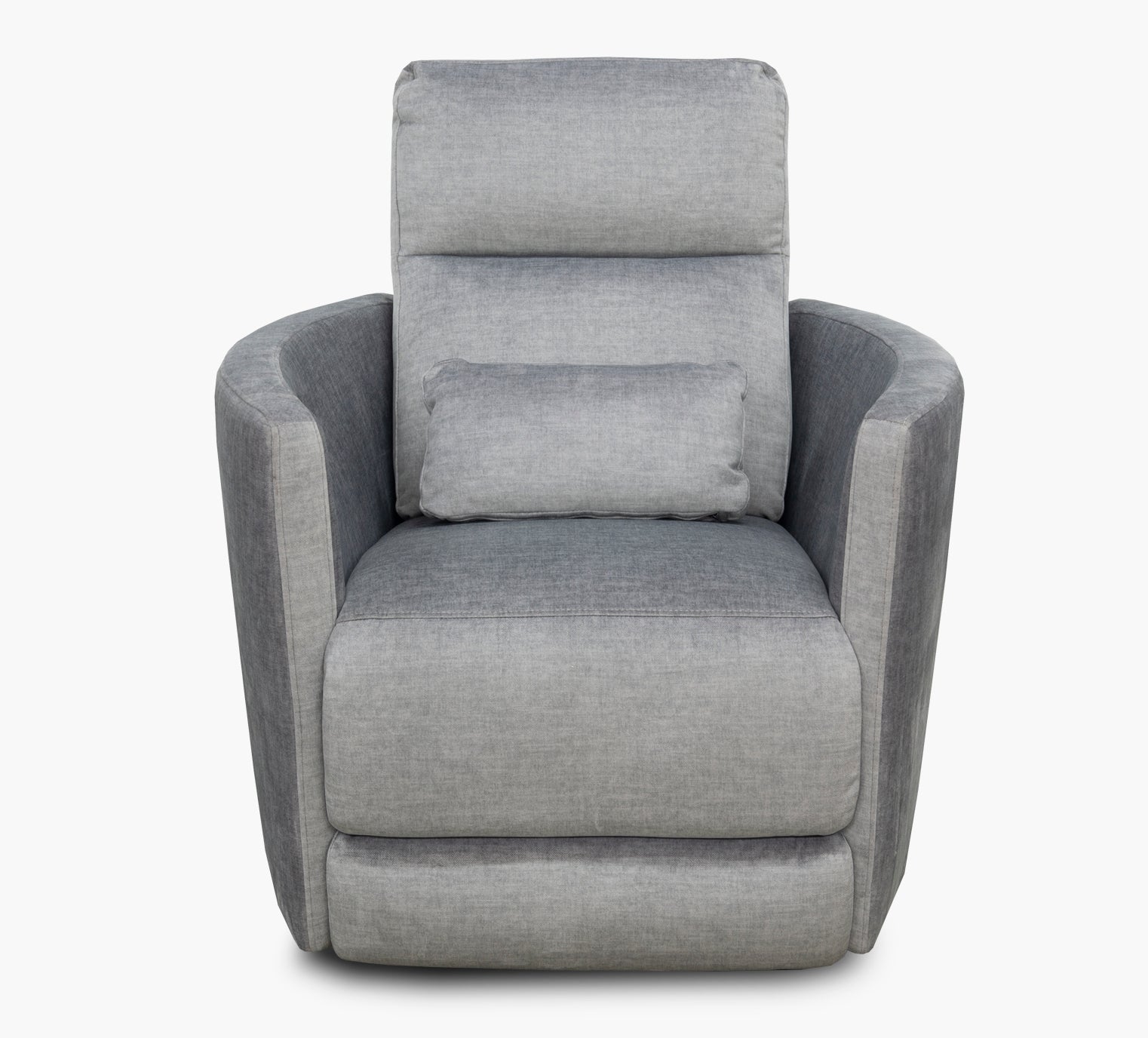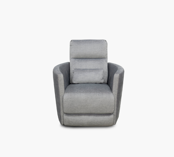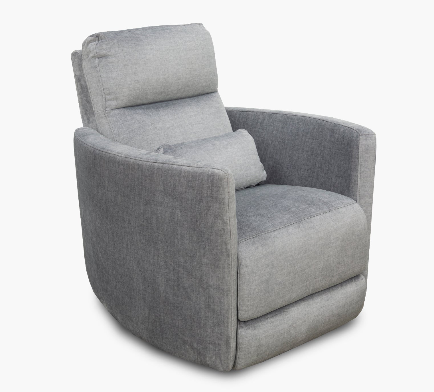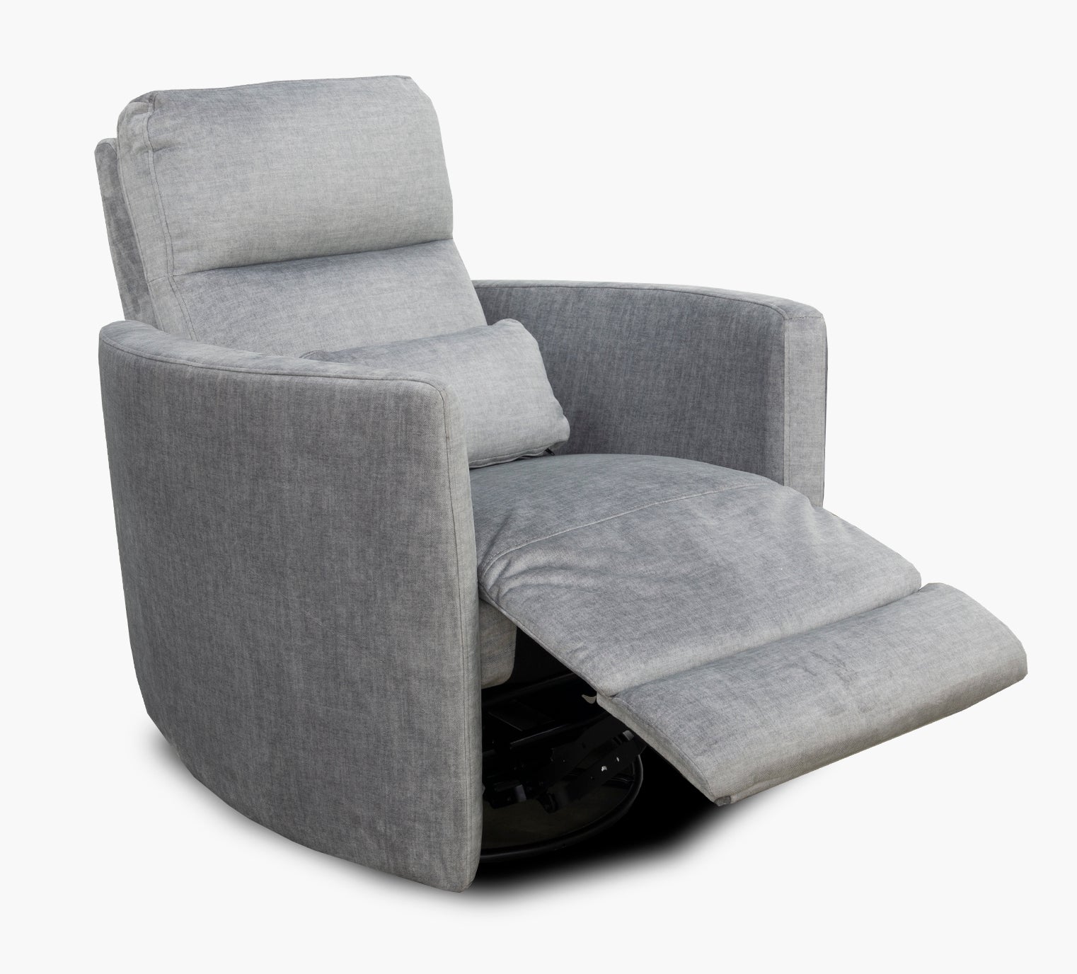 Contemporary swivel glider recliner upholstered in a soft silver polyester fabric. Features loose arm rest pillows and a pad-over chaise ottoman footrest. 2.0 high density, high resiliency foam cushion provides excellent comfort and support. 350lb weight capacity.
