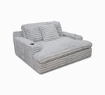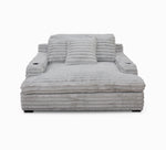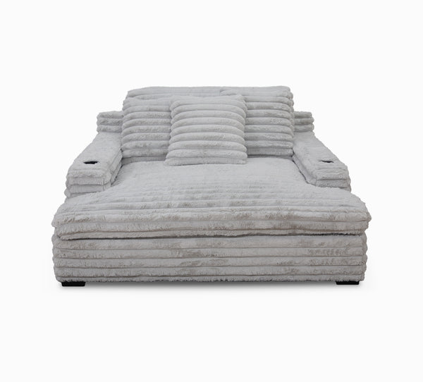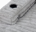 Casual chaise lounger upholstered in a light grey polyester fabric. Features a stylish and soft wide wale corduroy fabric with 3 matching throw pillows. Includes cupholders in each arm and a USB port. 100% Polyester CC: W