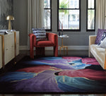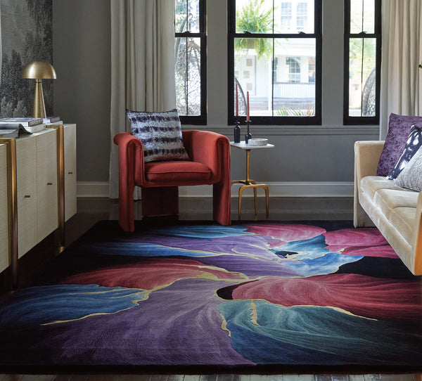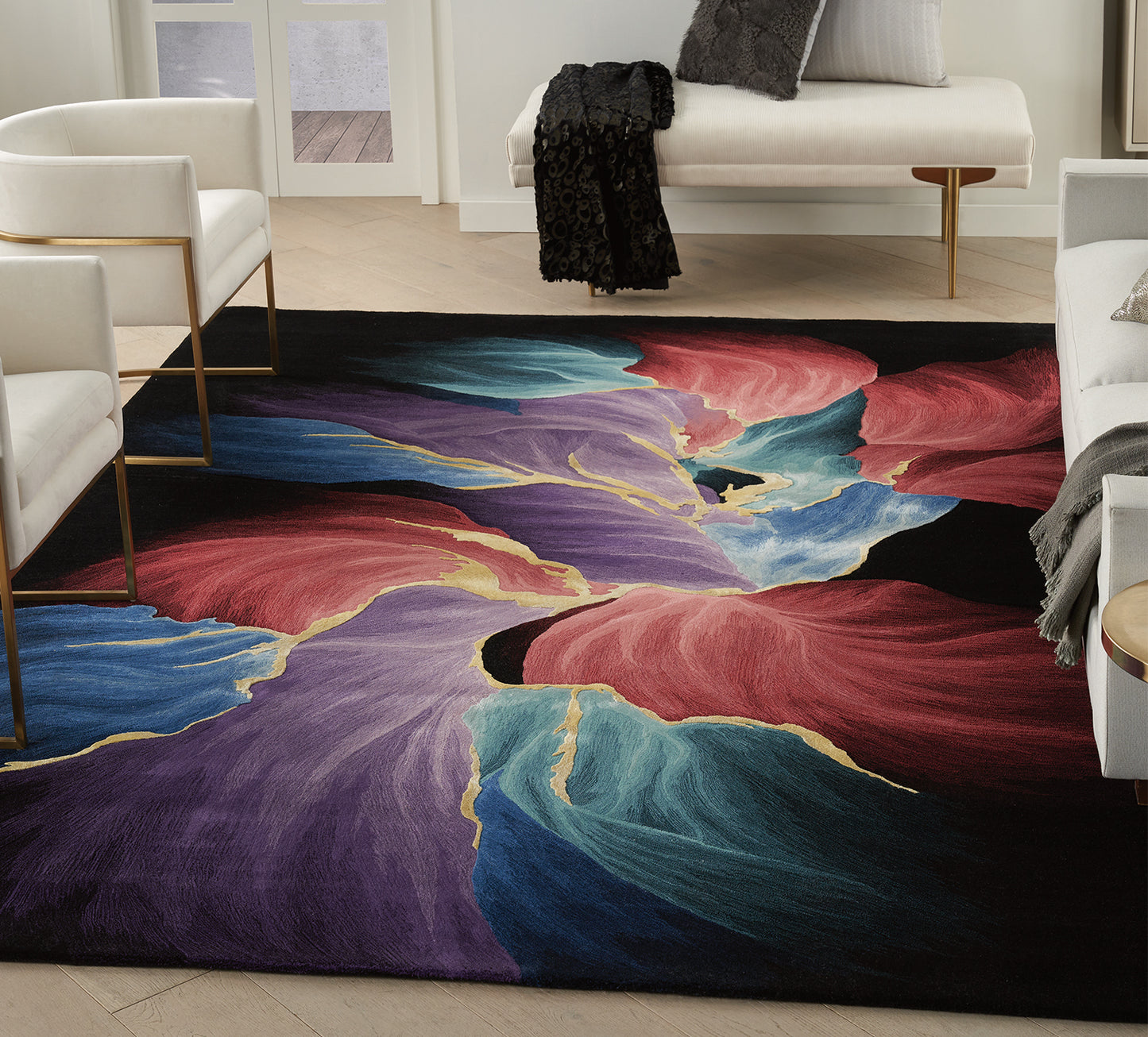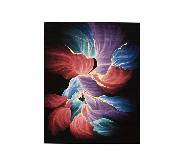 Bring mesmerizing style to your living room or bedroom with this abstract rug from the Cielo Collection. Vibrant strokes of purple, blue, red, and gold create movement across the solid black ground, which is enhanced with carved accents that add an eye-catching sense of depth. Handmade from a blend of premium New Zealand wool and silky Luxcelle.