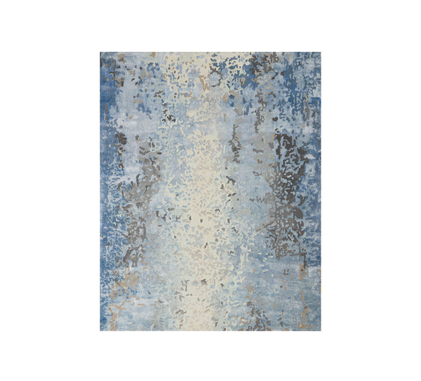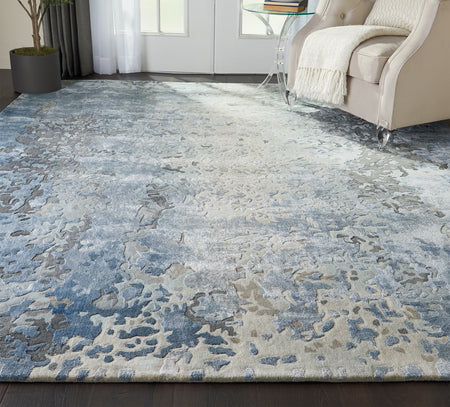 This contemporary abstract rug design from the Nourison Cielo Collection features ombred shades of blue and grey, hand carved into a meticulous abstract pattern. The thick wool pile features sleek Luxcelle highlights for exceptional depth, sheen, and texture, bringing stylish chic to any room in the home.