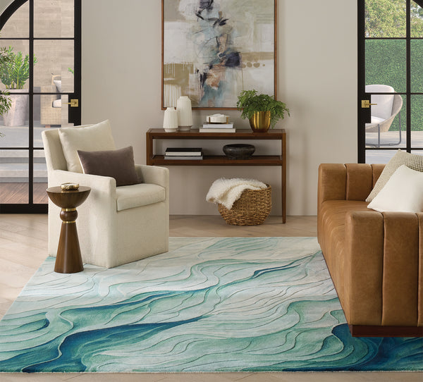 "Tight ripples of multi-toned green and silver come together in a mesmerizing pattern, punctuated by hand-carved accents that add a uniquely dimensional look. Handmade from a blend of New Zealand wool and silk-like Luxcelle fibers that beautifully capture changes in light.