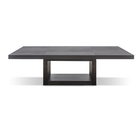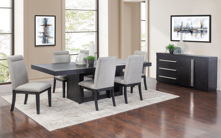 Create a contemporary dining experience with the Cosmopolitan Collection. The rectangular table features a bold geometric base and extends to an impressive 99 inches with two 20-inch leaves, making it perfect for gatherings large or small. Crafted from mixed wood and Acacia veneer in a sultry black wire-brushed finish, it pairs beautifully with slat-back chairs upholstered in soft beige velvet-like fabric. Cushioned with KanesComfort memory foam for lasting comfort, each chair supports up to 300 lbs, blending style and durability for everyday dining.