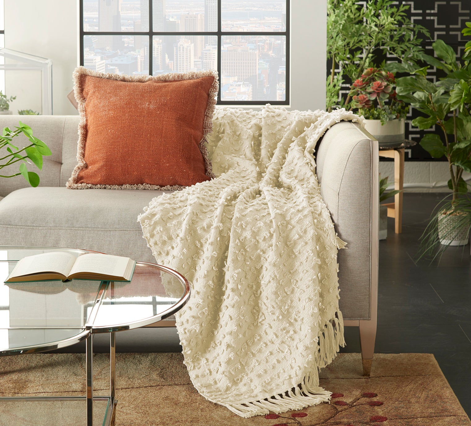 The neutral color palette paired with textural intrigue make this throw blanket a wonderful addition to any home. With fringed edges and a frayed dot pattern, this throw blanket will keep you cozy while adding an exciting flair to your decor. Recommend spot cleaning as needed using a gentle cleanser.