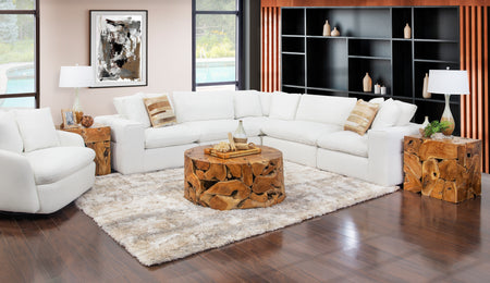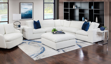 100% Polyester CC: WS Contemporary modular sectional in a soft white boucle performance fabric. Individual pieces make it easy to customize the configuration to fit your space. Features reversible fiber and feather bagged and baffled seat and back cushions as well as fully finished sides for total customization. Includes 9 throw pillows: 3 on the LAF chair, 3 on the corner, and 3 on the RAF chair. As shown, 5 piece sectional includes LAF Chair, 2 Armless Chairs, Corner, and RAF Chair. Overall dimensions as shown: 129"" x 129"" Blue throw pillows sold separately."